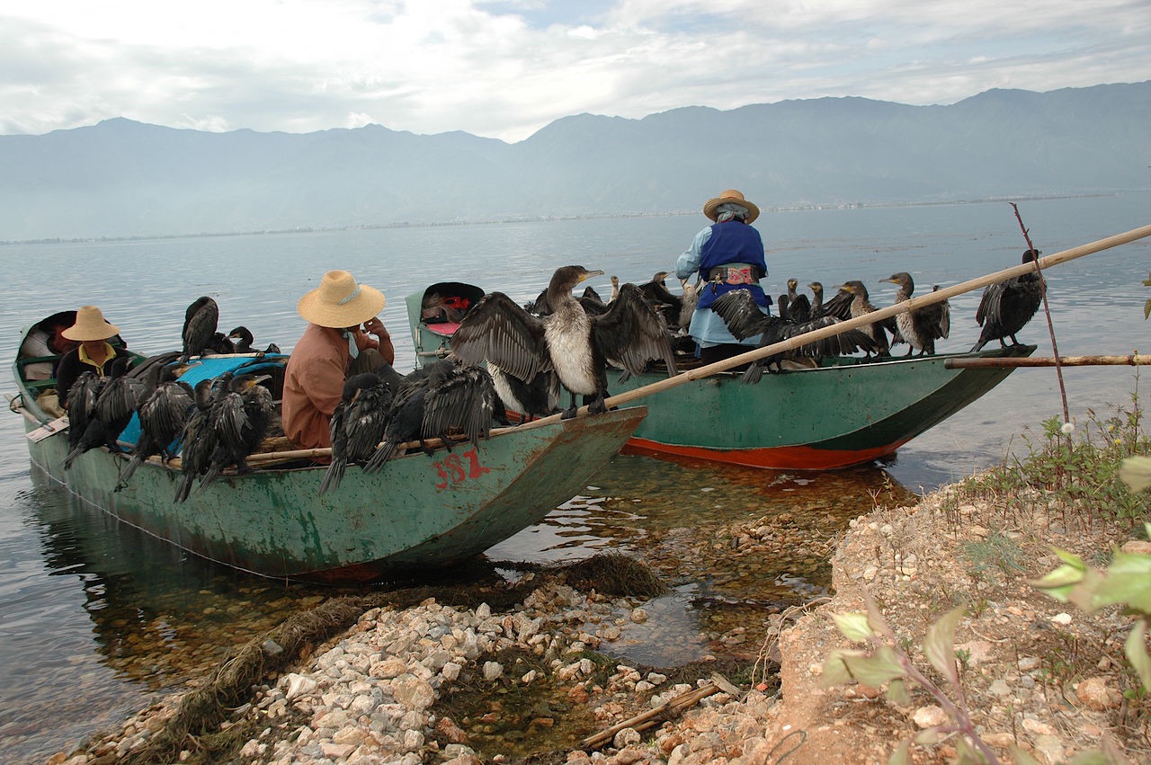 De vogels krijgen een touwtje om de nek zodat ze de vis die ze vangen niet kunnen doorslikken en zo af en toe worden de vogels dan beloond met een klein visje.