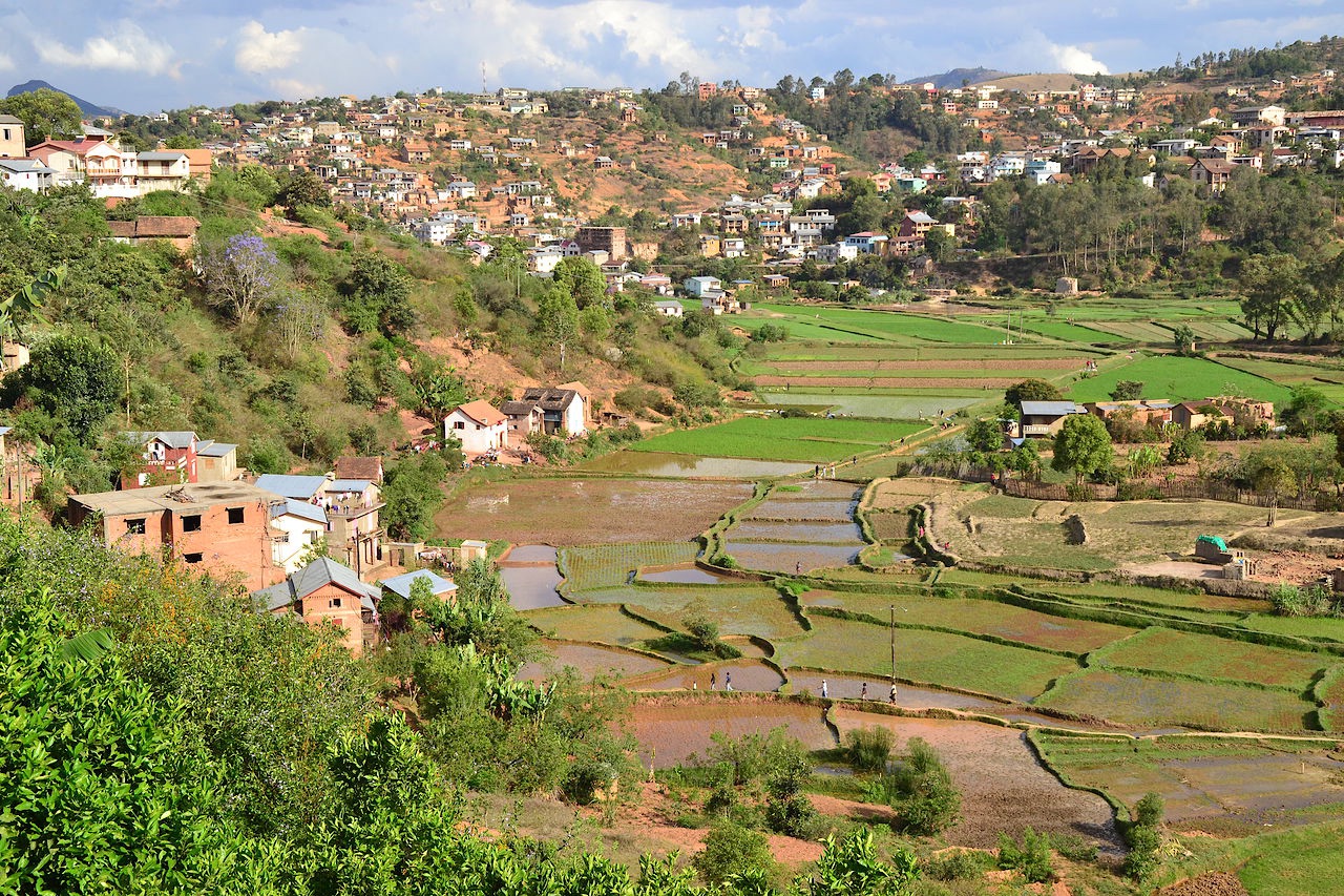 Onderweg zien we de omgeving langzaam veranderen, de rijstvelden maken plaats voor graslanden en in de verte is het Andringitra massief te zien. Het ziet er onheilspellend uit met de donkere lucht erboven.