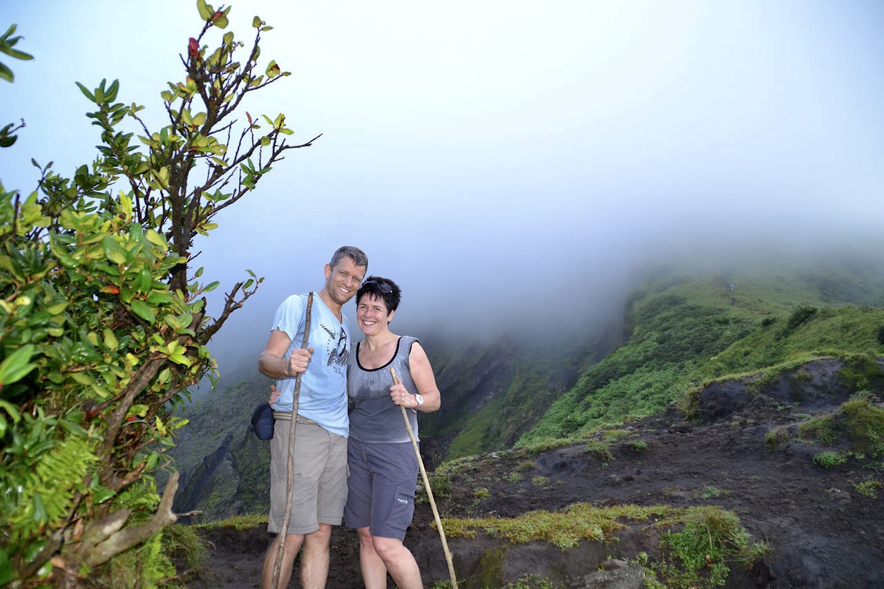 De gids zoekt voor ons een mooie stok uit die we kunnen gebruiken als steun tijdens de hike; we voelen ons gelijk nog 10 jaar ouder. We klauteren 2½ uur over wortels, door loopgraven en over rotsblokken om bij de boomgrens op 1000m te komen. Daar kunnen we eindelijk van de beloofde vergezichten genieten en zien dat de top van de vulkaan die (zoals gewoonlijk) in de wolken is verstopt. Het waait hier enorm en het kost moeite om te blijven staan. Onze benen voelen zwaar en we zijn erg blij dat we niet de 12 uur durende klim naar de top hebben besproken want dat was na de 50km fietsen van gisteren een hele lijdensweg geworden. We zien al op tegen de terugweg.