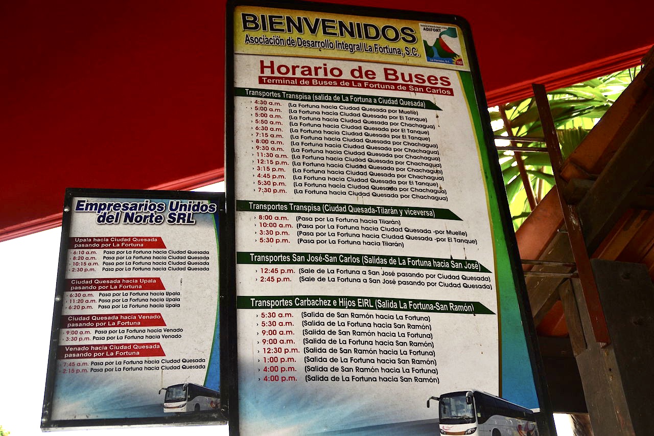Op het busstation hangt een overzichtelijk kaart met de vertrektijden van de bus en wij gaan met de 09:30 uur naar Ciudad Quesada om daar dan over te stappen op de expreso naar San José.