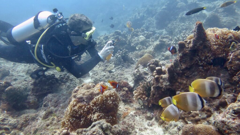 Iets na 12:30 uur stappen we weer op onze scooter en rijden naar de baai voor onze volgende duik. Het verloopt dit keer allemaal wat soepeler en al snel gaan we onder water. Terwijl we nog over de zandbodem schuiven, hebben we onze eerste vangst al binnen; een zeepaardje wiegt heen en weer op de golfbeweging van het water. Dat is ook al een beestje dat wij niet vaak gezien hebben. We hangen daarna even stil bij prachtige, wuivende anemonen met daarin natuurlijk clownsvisjes die brutaal je camera aanvallen. Wanneer we verder zwemmen zien we opnieuw een schildpad liggen onder een overstekend stuk koraal. Het beestje ligt te slapen, dus we gaan hier snel weer weg. We spotten nog een kleine murene, een schorpioenvis wat garnalen en felgele trompetvis en dan ineens zien we opnieuw een schildpad liggen. Bovenop oranje gekleurd koraal is het een prachtig plaatje. Cris wil een foto maken van ons en de schildpad en we manouvreren zo voorzichtig mogelijk tot schuin achter de schildpad. Leuke familiefoto voor op de schoorsteenmantel.