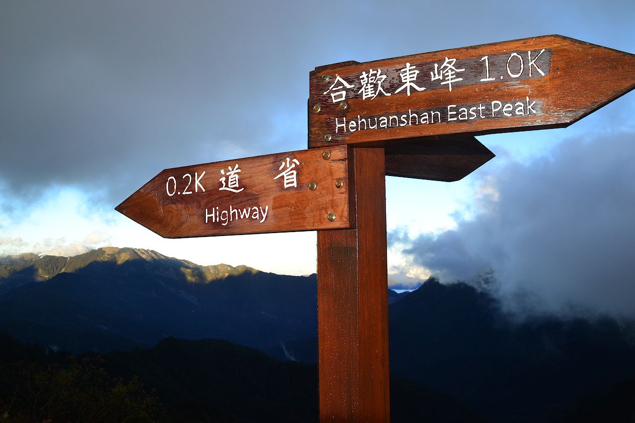 De uitzichten zijn fantastisch, met verschillende hoge bergtoppen in zicht en een prachtig wolkendek in een verderop liggende vallei. De hele omgeving lijkt wel wat op een hooggelegen wintersport gebied, maar dan zonder sneeuw. Wanneer we boven zijn gaan we even op een steen zitten om bij te komen. We krijgen van een Taiwanese man die net met een groep naar boven is gekomen een sinaasappel aangeboden en hij wil ons graag even op de foto zetten; vooruit maar dan.