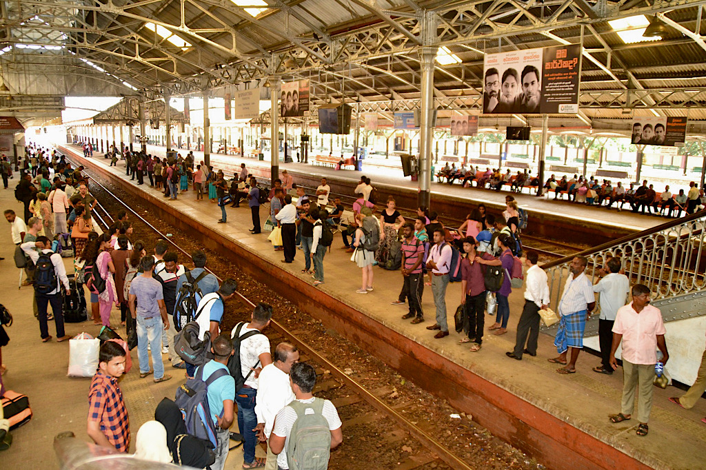 Terug bij het hotel pakken we onze rugzakken, checken uit en laten ons door een tuktuk bij het station van Colombo Fort afzetten. Op de borden lezen we dat we op perron 3 moeten zijn. We zijn erg op tijd, dus dat geeft ons de kans dit oude treinstation even te verkennen. Wat ons op het treinstation vooral opvalt is de beroerde toestand waar de treinen in verkeren. Wij hoeven toch niet 4 uur in zo’n barrel te zitten? Wat ook opvalt is dat de treinen allemaal mooi tijd vertrekken. Je zit dan wel in een soort veewagen, maar ze rijden mooi op tijd.