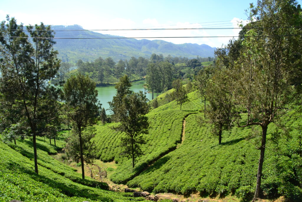 Op het busstation kopen we een fles drinken en een paar vage gefrituurde hapjes die uiteindelijk lekker blijken te smaken. Er gaat buiten het seizoen geen rechtstreekse bus meer naar Delhousie, wordt ons verteld, dus nemen we de bus naar Maskeliya en dan stappen we daar over op de bus naar Delhousie. Het tochtje naar Meskeliya is prachtig en gaat rond een prachtig blauw meer. Ondanks de slakkengang van de bus, vliegt dit ritje van 20km voorbij. Om 14:30 uur staan we in de hoofdstraat van Maskeliya.