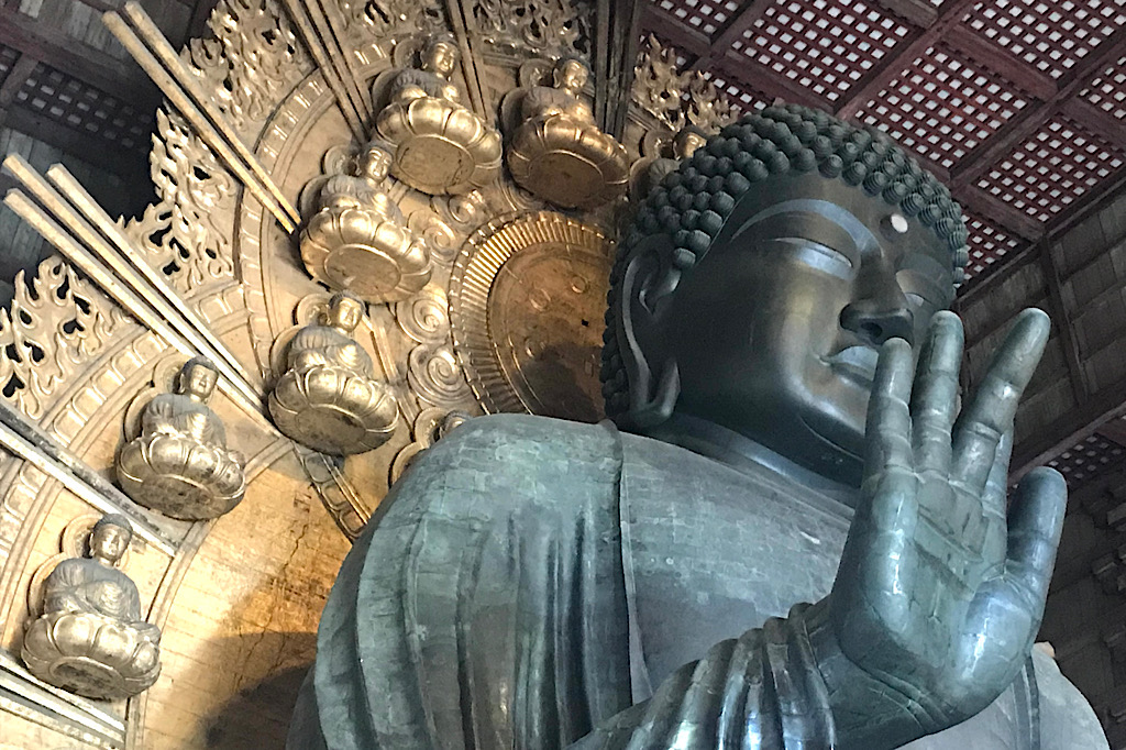 Nadat we 764 hertjes ontweken hebben komen we dan via de Nandai-mon (zuidelijke poort) bij de Todai-ji. Deze tempel bied onderdak aan de mega boeddha van Nara (Daibutsa). Dit boeddhabeeld is een van de grootste bronzen beelden ter wereld en is oorspronkelijk in het jaar 746 gemaakt. Het beeld is ruim 16m hoog en is gemaakt van 437 ton brons en 130 kg goud. Deze grote boeddha staat in de Daibutsu-den, wat het grootste houten gebouw in de wereld is. Door de eeuwen heen heeft het beeld behoorlijk wat te verduren gehad van aardbevingen en branden, waarbij hij z’n hoofd een paar keer is kwijt geraakt, maar tegenwoordig zit deze beeltenis van Vairocana Boeddha er parmantig bij.