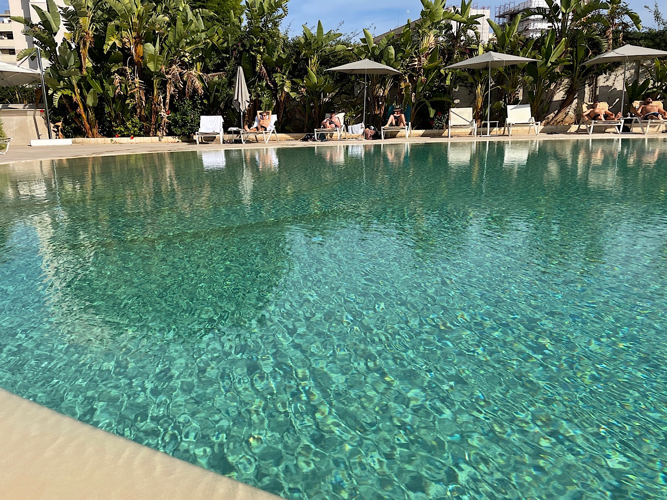 Het is gelukkig niet druk bij het zwembad. We gooien onze handdoeken op een bedje in de zon en plonsen het zwembad in: even afkoelen!