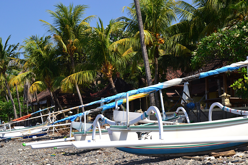 Na dit waterballet rijden we terug naar Amed waarbij we nog even een tussenstop maken voor een drankje in down-town Amed. We hadden nog geen gelegenheid gehad om de Jukung, de typische Balinese vissersboten van dichtbij te bekijken en die liggen hier op het strand. Dat kunnen we nu ook afvinken.