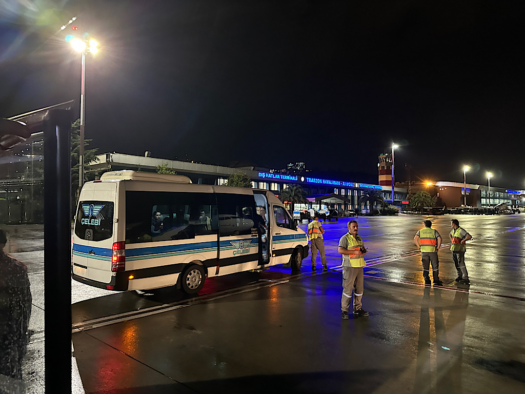 Het vliegtuig wordt bijgetankt en na ongeveer een uur brullen de motoren weer en gaan we weer de lucht in. De buienradar van de piloot blijkt betrouwbaar te zijn want na een rustig halfuurtje vliegen landen we in een nat en druilerig Trabzon.