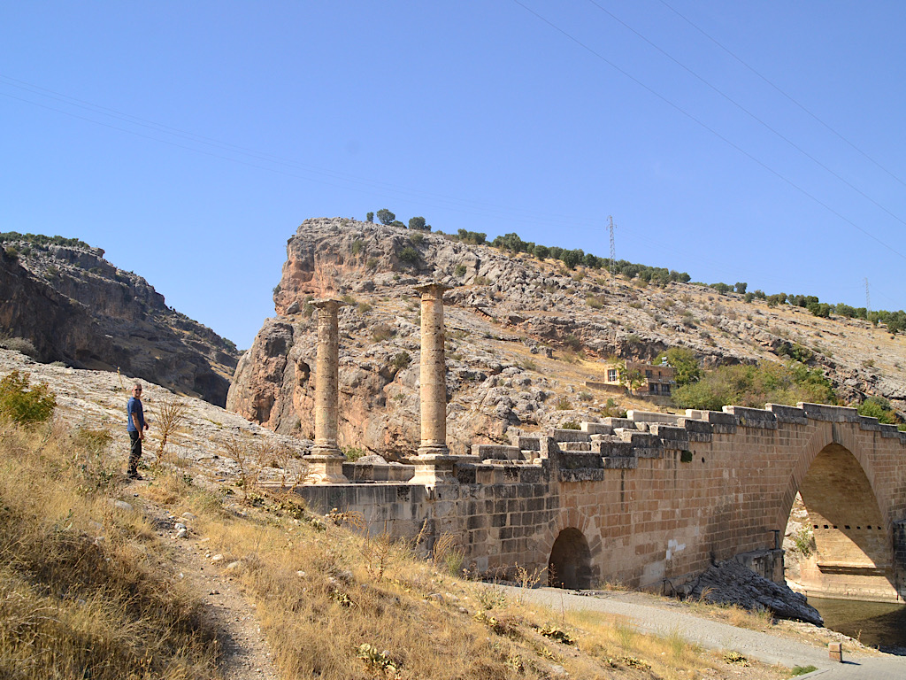 Bij een 1800 jaar oude brug (die pas 15 jaar niet meer gebruikt wordt door auto’s) staan een tweetal kolommen die ter ere van de Romeinse keizer Septimius Severus en keizerin Julia Domna zijn gebouwd. Deze kolommen maken ook deel uit van de archeologische site waar we net geweest zijn. De zuilen staan bekend om hun historische en symbolische waarde en markeren een tijdperk waarin het Romeinse Rijk invloed kreeg over de regio.