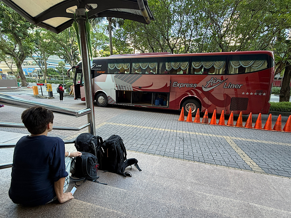 Uiteindelijk wordt ik goedgekeurd door de douane-meneer en gaan we op zoek naar de bus die ons naar Melaka moet brengen. Dit is een andere bus en omdat er een hele rij bussen staat moeten we even goed de nummerplaat checken.